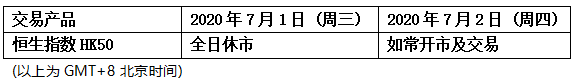 因应香港回归假期,香港市场恒生指数HK50将于2020年7月1日全日休市,敬请阁下留意知悉!