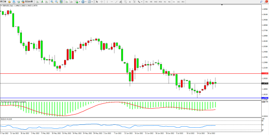 市场空头下行趋势态势良好,低位短期得到支撑反转整理上行,上方压制关注1.21249附近震荡, 低位支撑关注1.17562附近,短期低位多头上移动力有减弱迹象,MACD指标处于空头区域维持缓慢上移,RSI指标处于50均衡线下侧徘徊,如图: